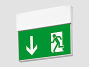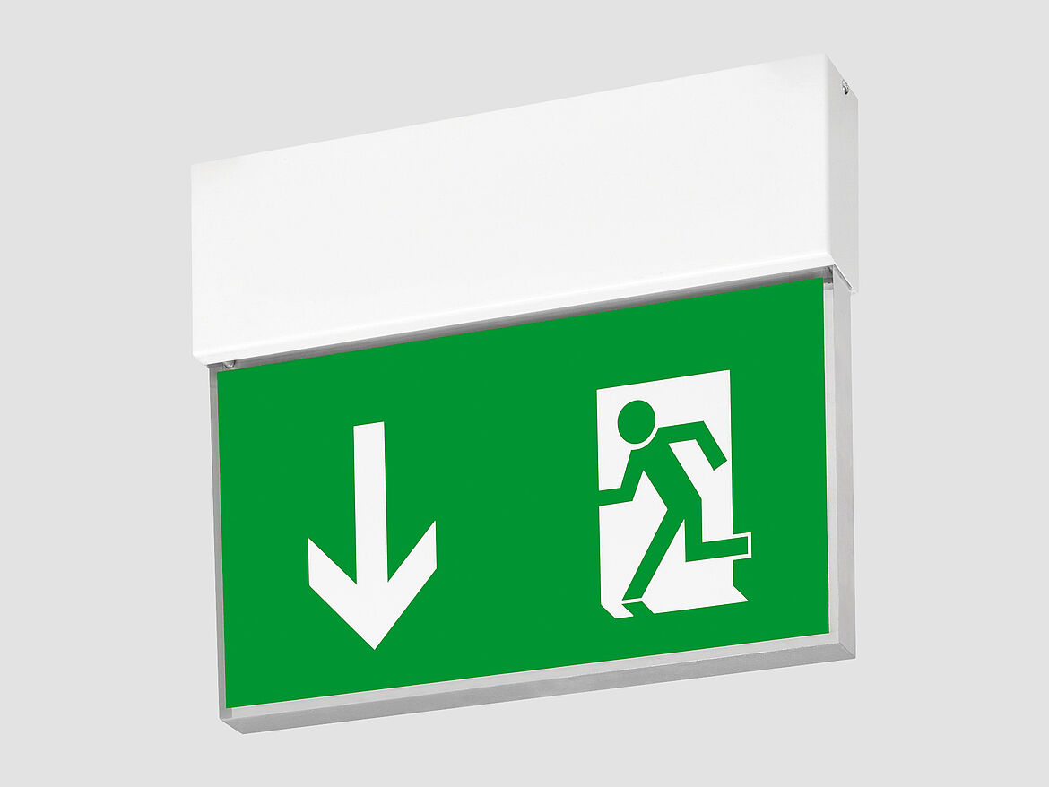 SICUROLUX-ES is an escape sign luminaire in accordance with DIN EN 60598-1/-2-22 and DIN EN 1838. The frame is made of white galvanised metal and is characterised by its flat design. The 20 mm thick light-deflecting pane is illuminated by 12 x 0.5 W LED lights. The escape sign luminaire can be mounted on walls, ceilings or flush with the ceiling. The accessories, consisting of pictograms, pendant tube, wall bracket and recessed housing, make SICUROLUX-ES versatile and customisable.