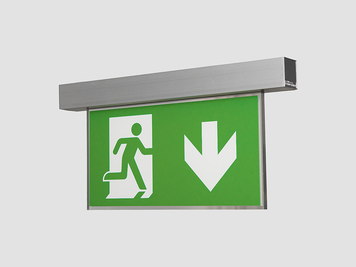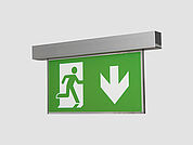 SICUROLUX-TAL300 is an escape sign luminaire luminaire or safety luminaire in accordance with DIN EN 60598-1/-2-22 and DIN EN 1838 for marking escape routes. The bracket of the emergency luminaire is made of a clear anodised aluminium profile. The luminaire is mounted on the ceiling. The accessories include pictograms, a wall bracket and a steel cable hanger which make the SICUROLUX-TAL300 versatile.